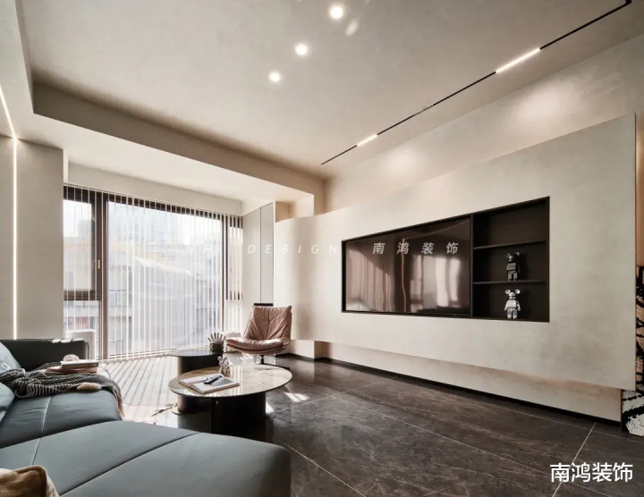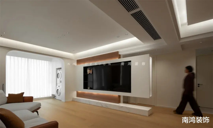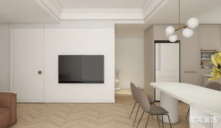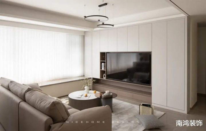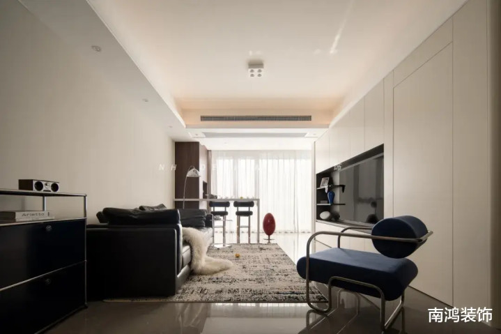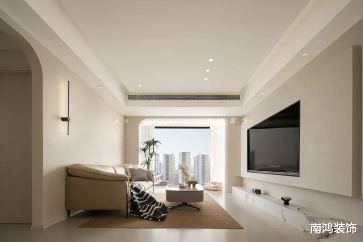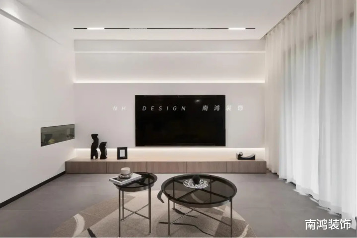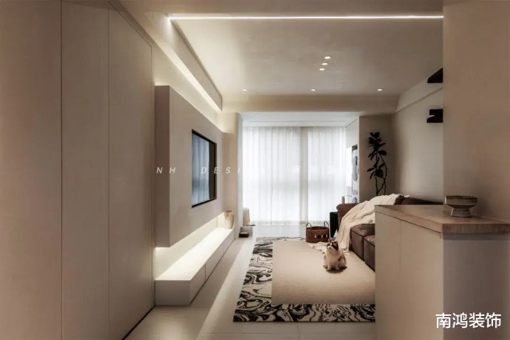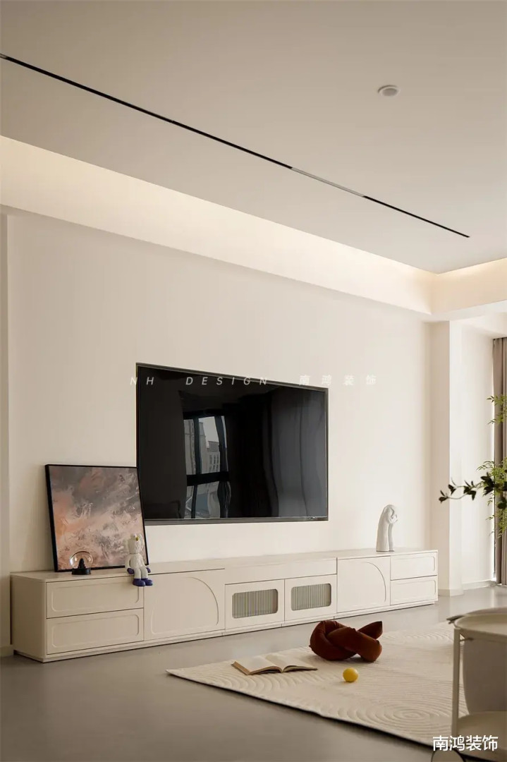 二是直接壁挂电视+去电视柜设计,彻底贯彻“少即是多”的理念。墙面仅保留必要的设备与线路隐藏处理,舍弃一切冗余装饰,不仅视觉上清爽开阔,也便于日常清洁打理。