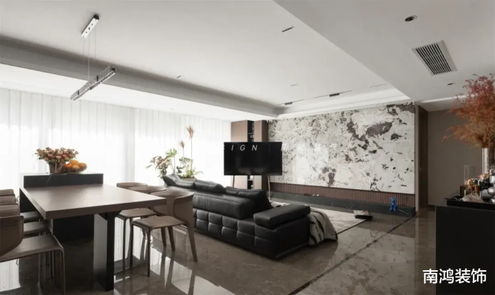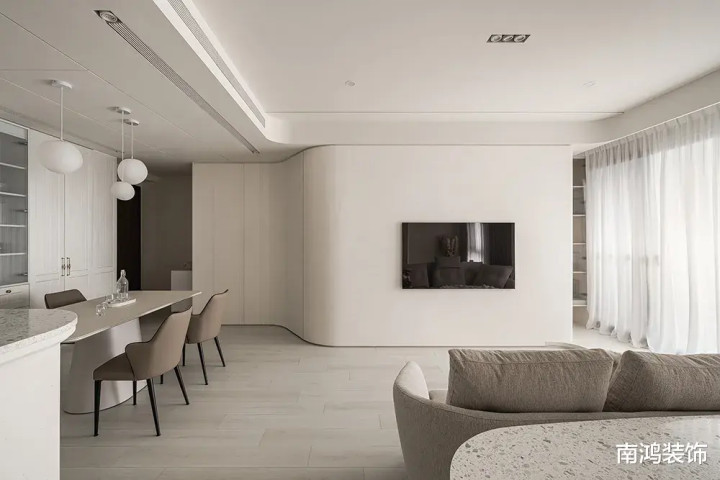 将电视墙居中规划,既能自然划分客厅与餐厅(或其他功能区),又不会完全阻隔视线与光线,让空间保持视野开敞,一举两得。