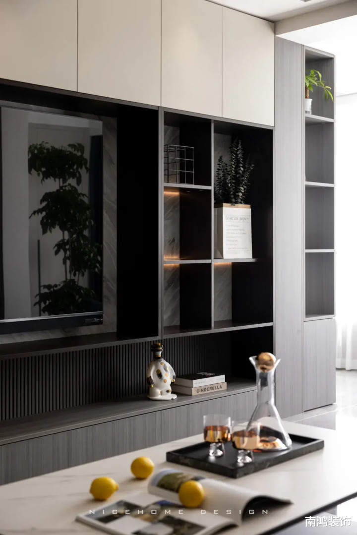 我们可以将电视嵌入定制柜,再使封闭柜与开放格/搁板相结合,收纳展示两不误。