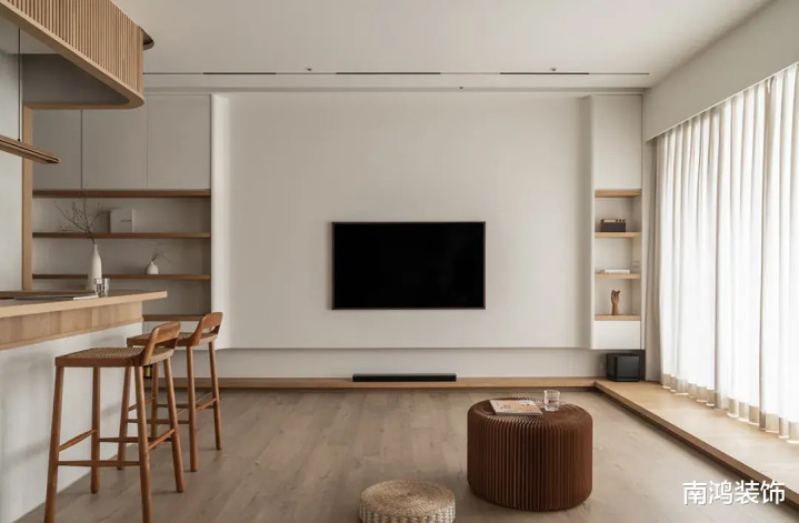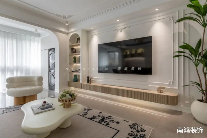 一是用石膏板做凹凸造型,电视机嵌入墙面,实现屏幕与背景齐平。搭配木质层架,简约高级的设计感,尤其适合极简、侘寂、奶油等风格的家居氛围。