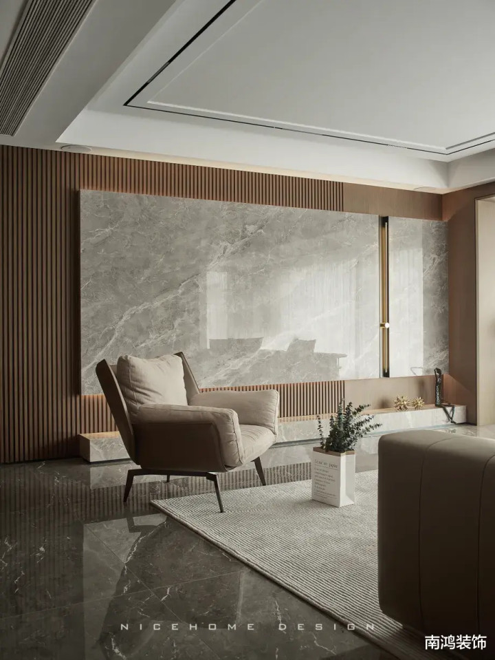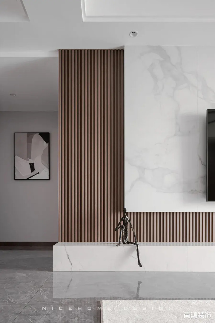 不仅仅是美观,这款背景墙在实际使用中也颇具亮点。格栅线条不仅质感温润,还可纵向延伸空间感,石材则自带质感,冷暖材质碰撞,打造一方恰到好处的轻奢氛围。